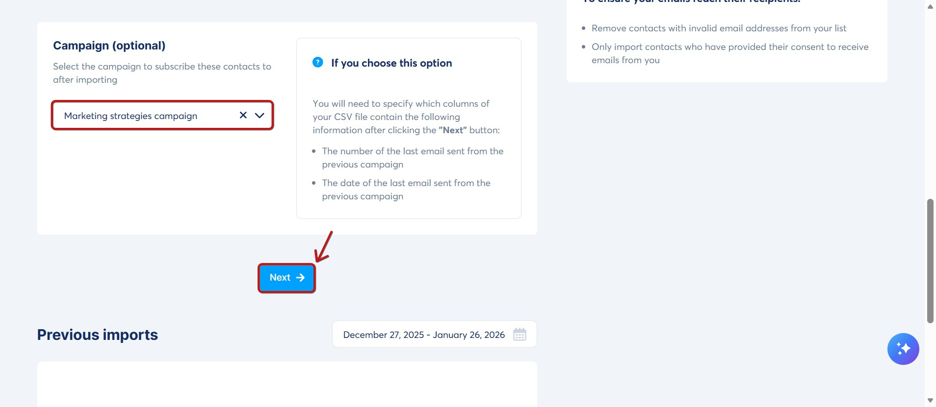 När du importerar din kontaktlista till systeme.io, klicka på rullgardinsmenyn Kampanj (valfritt) och välj den kampanj du väljer. Klicka sedan på Nästa.