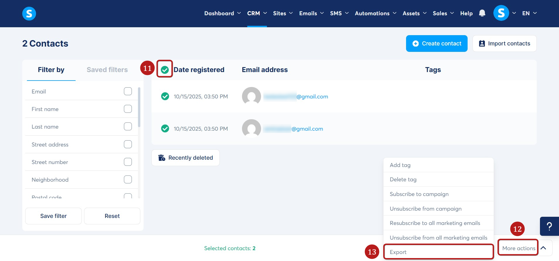 Välj de kontakter du vill exportera (11), klicka sedan på Fler åtgärder (12). Från listan med åtgärder, klicka på Exportera (13).