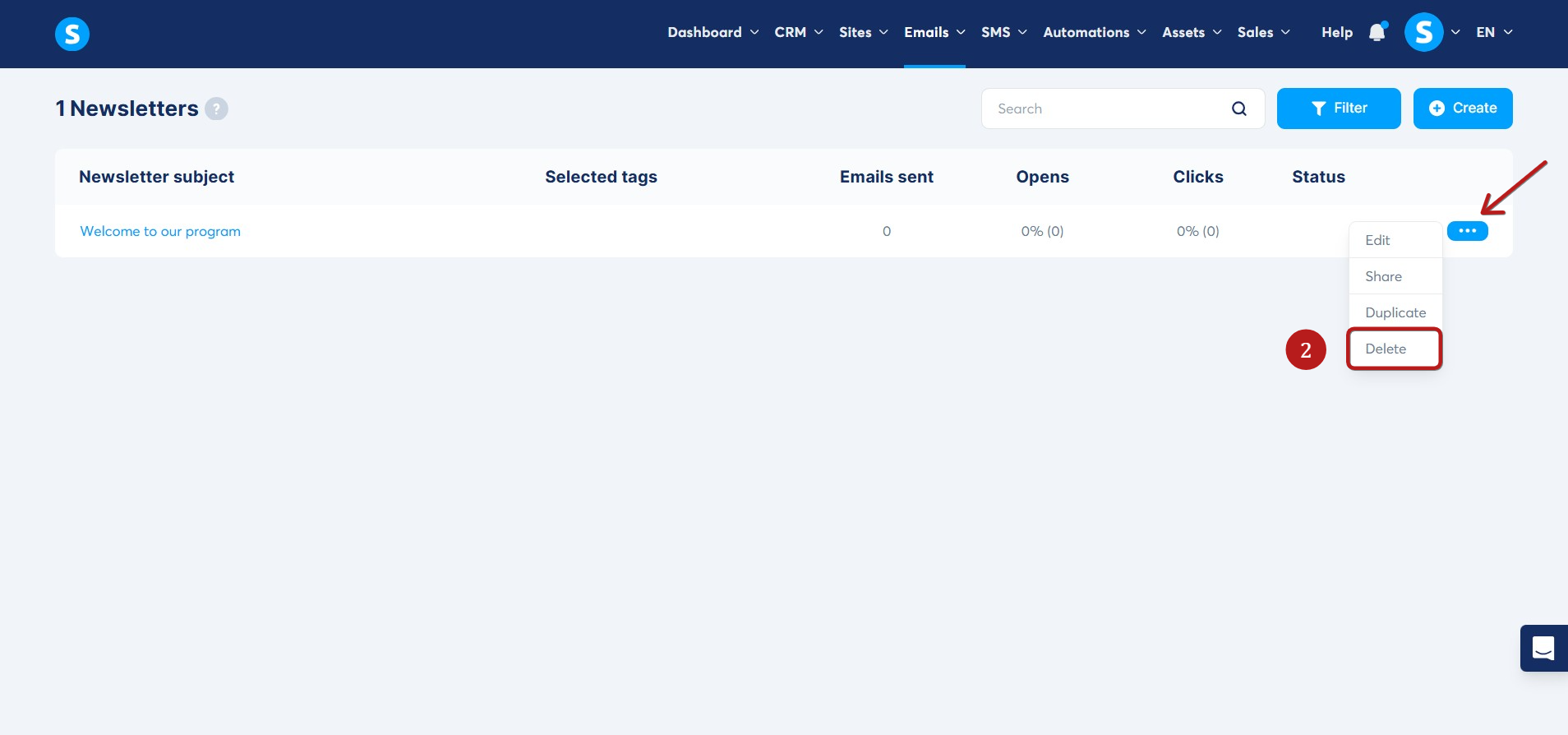 Hitta nyhetsbrevet du vill radera, klicka på de tre prickarna (...), och sedan på Radera (2).
